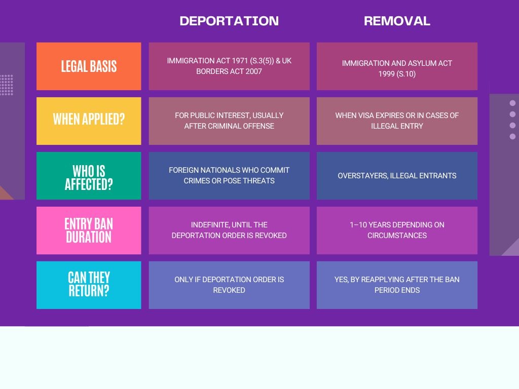 Unlike deportation, removal is typically used for less serious immigration breaches, and individuals may reapply to return to the UK after a certain period. However, entry bans ranging from 1 to 10 years may still apply depending on the circumstances.
