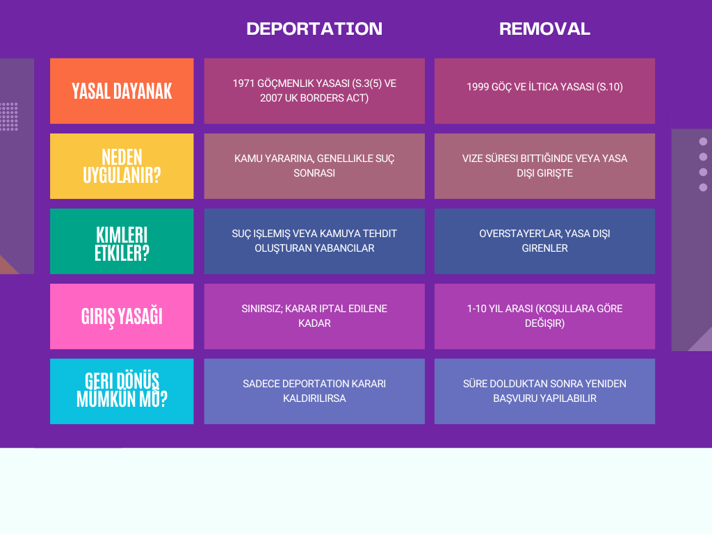 Removal işlemi, deportation’dan farklı olarak genellikle daha az ciddi durumlarda uygulanır ve kişi belirli bir süre sonra yeniden başvuru yaparak İngiltere’ye dönebilir. Ancak yine de 1 ila 10 yıl arasında değişen giriş yasakları söz konusu olabilir.